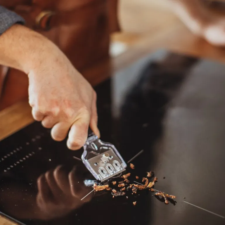 Det svarte, gummierte håndtaket gir godt grep og komfort under bruk, og lar deg fjerne fastbrente flekker uten å skade overflaten. Inkludert følger fem ekstra blader, slik at du alltid har utskiftning for hånden. Ideell for induksjons- og keramiske topper.
