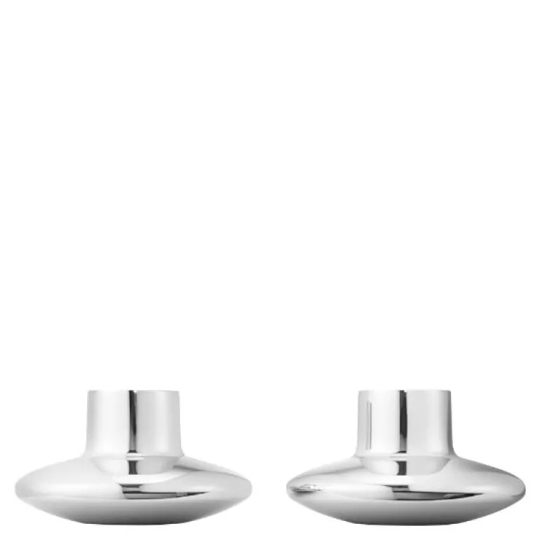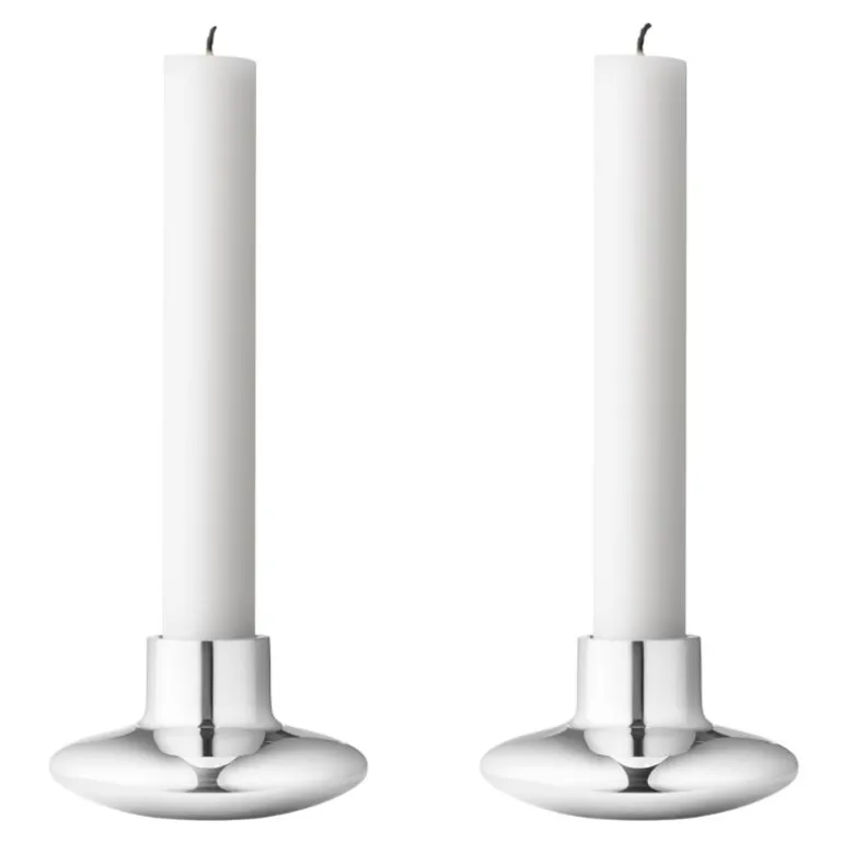 Sett med to lysestaker, Henning Koppel, fra Georg Jensen. Denne lille og vakkert rundede lysestaken ble opprinnelig designet i sølv, og ble først fremstilt i aluminium. Nå fås den i rustfritt stål og utgjør en vakker lyskilde i ethvert hjem.Helt siden 1904 har den tidløse skandinaviske designen fra Georg Jensen spredt glede og eleganse gjennom en unik kombinasjon av håndverk, funksjonalitet og kunstnerisk estetikk. Fra masterpieces til smykker, produkter til hjemmet og klokker dekker det varierte utvalget av designobjekter alle dine behov og ønsker.