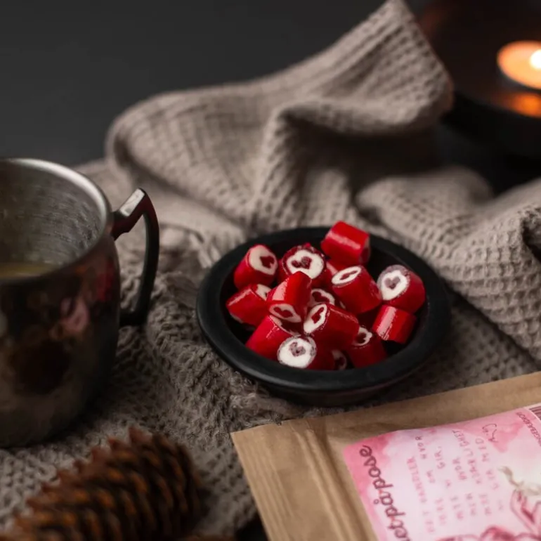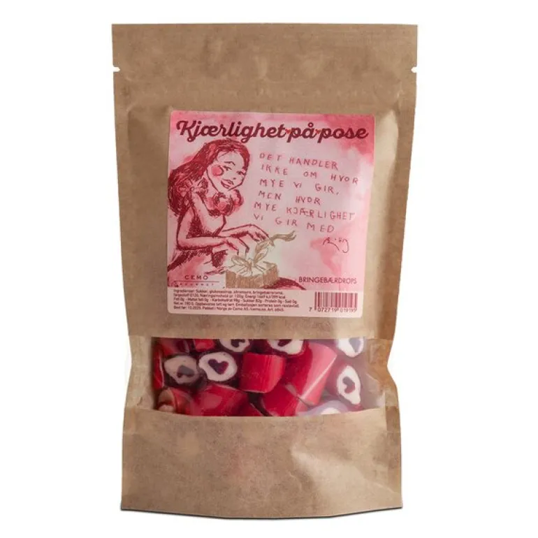 Herlige Fristelser Kjærlighet på pose 180g fra Cemo. Disse bringebærdropsene er søte og friske, og hver bit bringer med seg en dose kjærlighet. Den friske smaken av bringebær gjør dem til en favoritt blant både store og små. Nydelig illustrert av kunstneren Björg Thorhallsdottir