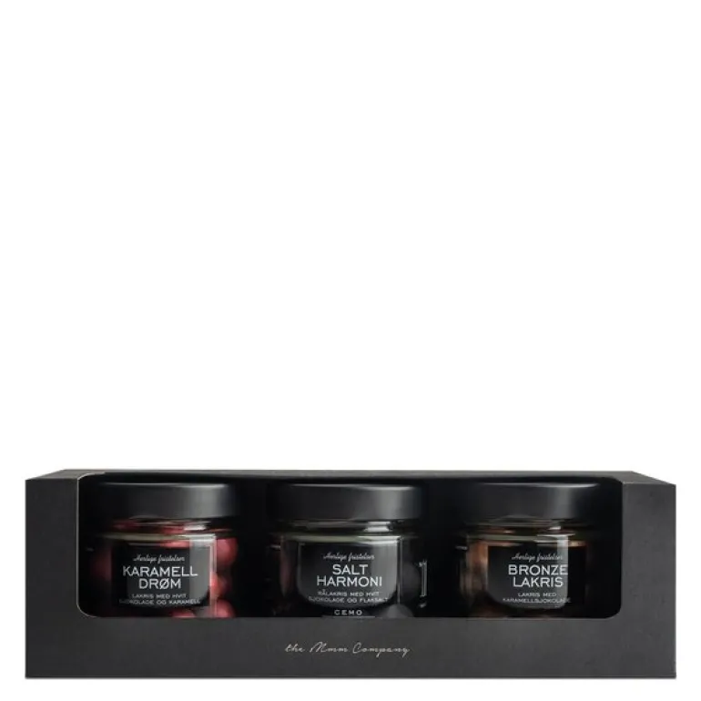 - Karamelldrøm: Sukker, kakaosmør, helmelkspulver, sirup, maismel, invertsukker, lakris, salt, stabilisator E420, konserveringsmiddel E202, ammoniumklorid, emulgator (soyalecitin), aroma (vanilje, karamell), fargestoff E172, overflatebehandlingsmiddel (kokosolje, E903). Kan inneholde spor av hasselnøtter og mandler. Salt harmoni : Sukker, kakaosmør, helmelkspulver, sirup, maismel, invertsukker, lakris, rålakris (0,9%) islandsk flaksalt (0,8%) salt, stabilisator E420, konserveringsmiddel E202, fargestoff E153, emulgator (soyalecitin), vaniljearoma, overflate- behandlingsmiddel (kokosolje, karnaubavoks). Den hvite sjokoladen inneholder minst 29% kakaotørrstoff. Kan inneholde spor av hasselnøtter og mandler. Bronse lakris: Sukker, kakaosmør, melasse, hvetemel, helmelkspulver, laktose, ammoniumklorid, lakrisekstrakt, vann, skummetmelkpulver, emulgator (soyalecitin), kokosolje, kokosfett, emulgator (E471), anisaroma, farge (jernoksider og hydroksider), overflatebehandlingsmiddel (skjellakk), vegetabilsk olje (kokos). Kan inneholde spor av nøtter og mandler.