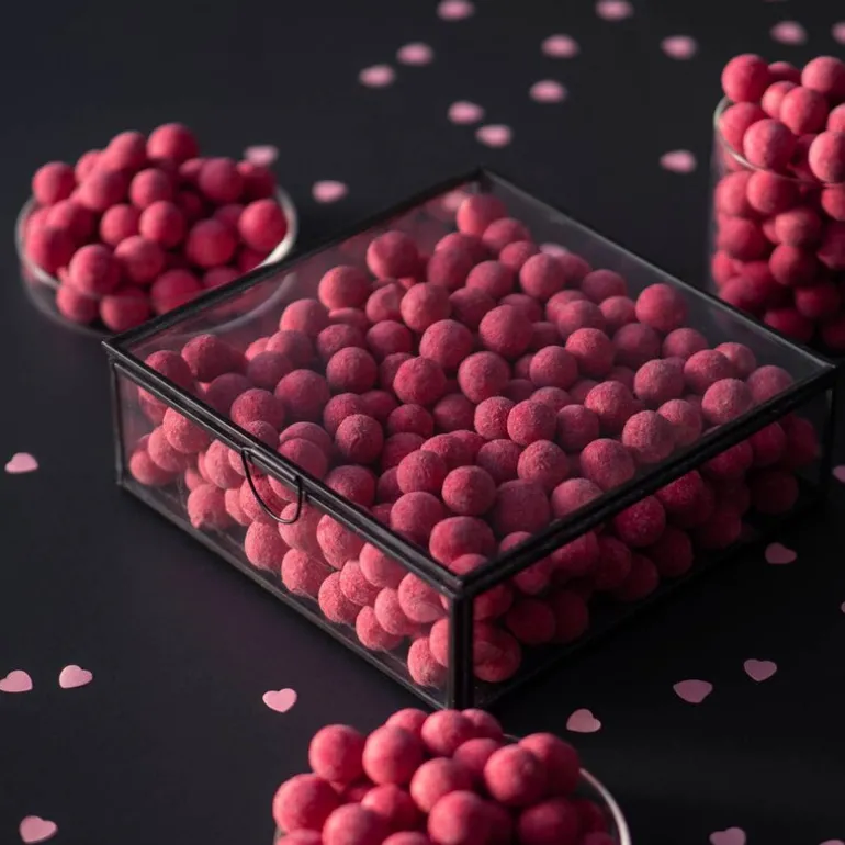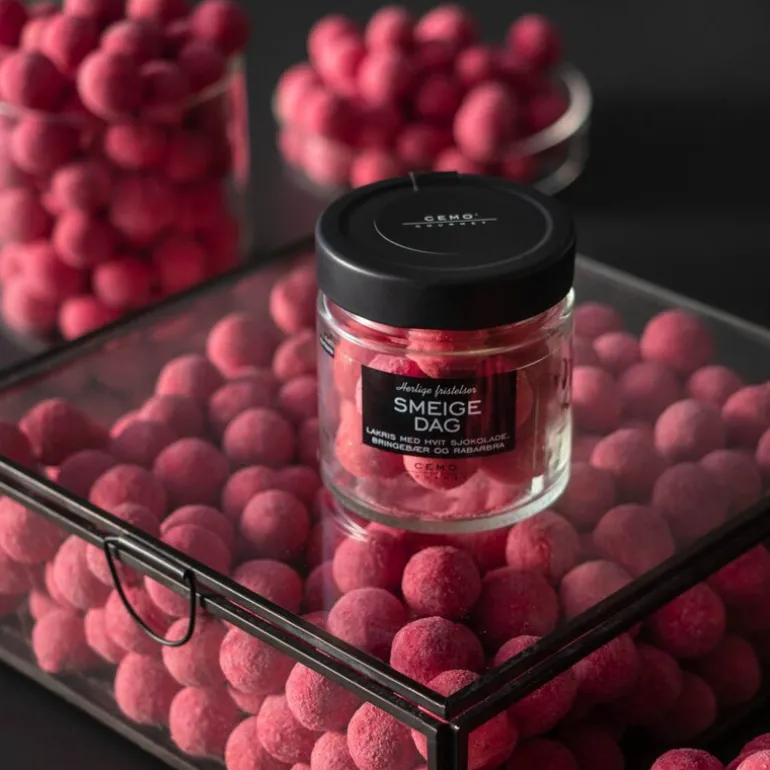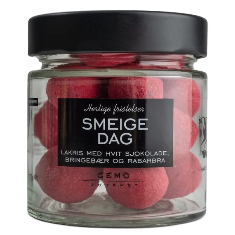 Herlige Fristelser lakriskuler smeigedag fra Cemo. På Sørlandet beskrives en varm og solfylt sommerdag som en «smeigedag», og våre fristende røde lakriskuler fanger essensen av disse deilige dagene. Hver bit av disse lakriskulene kombinerer den søte smaken av bringebær med den friske syrligheten fra rabarbra, kombinert med fløyelsmyk hvit sjokolade.