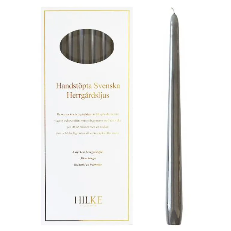 Hilke Collections svenske håndstøpte herregårdslys i grå, er laget i fineste kvalitet og har en fantastisk glans. Lysene er kun overflatedyppet i farge og ikke gjennomfarget, det er det beste for både miljøet og lysets brennende egenskaper og gir rike vakre farger. Lysene er laget av stearin og parafin. Stearin sammen med den rette veken får lyset til å brenne med en vakker, stor og klar flamme uten verken å røyke eller renne. Lysene kommer i en vakker gaveeske og er perfekte som en gave, og er et perfekt supplement lysestakene.