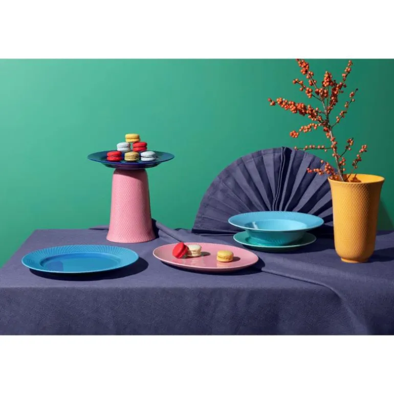 Herringbone er det ultimate klassiske mønsteret, berømt for sin særegne struktur. Stram geometri uttrykkes på en organisk måte, og dermed har vårens nye duker flere kryssreferanser til Rhombe-serien, som i likhet med Herringbone kommer i blå nyanser som lar det diskré mønsteret komme frem fra de fargemettede overflatene. I tillegg til de eksisterende dekkebrikkene, har Herringbone-serien også nå duker i 100 % økologisk vevd bomull som bygger bro mellom porselenskulturen og tekstiluniverset. De nye dukene hyller sesongens blå- og sandfarger og kan brukes til både den klassiske hvite Rhombe- og Rhombe Color-serien, hvilket gjør det mulig å skape en varm og personlig bordsetting. Design Lyngby porselen