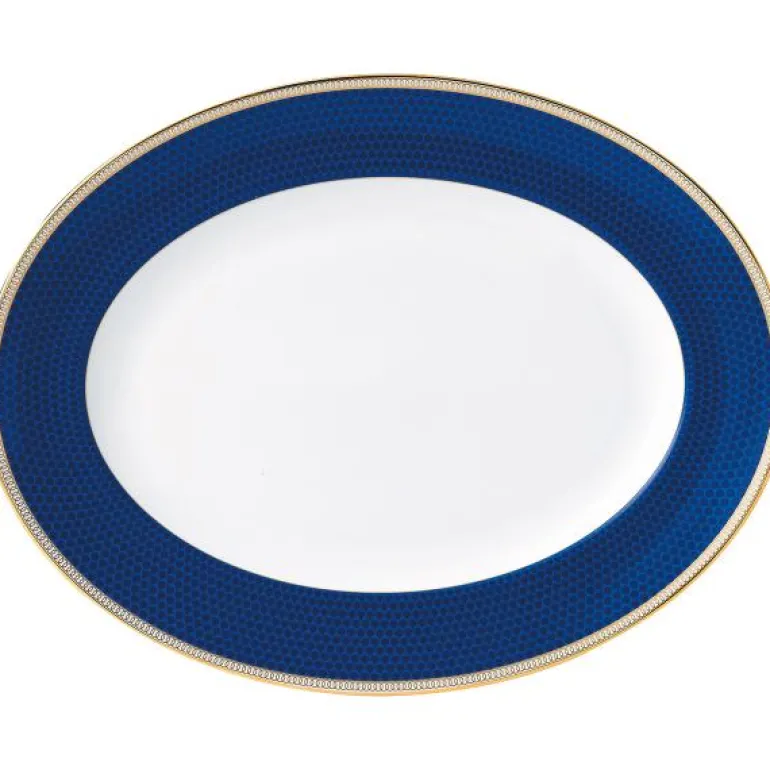 Hibiscus Oval Platter 35cm/13.7in. Inspirert av et Wedgwood-arkivmønster som dateres tilbake til rundt 1810, er Hibiscus en sofistikert kolleksjon med tidløse, klassiske elementer og rikt utsmykket med gull. Dette stilige mønsteret har et slående design av orientalske blå nyanser og overdådige botaniske detaljer, og med 22 karat gull påført for hånd for en elegant og overdådig finish. Perfekt til formelle middager, men kan også bruke som et stilfult alternativ til hverdags. Er flott i kombinasjon med hvitt.