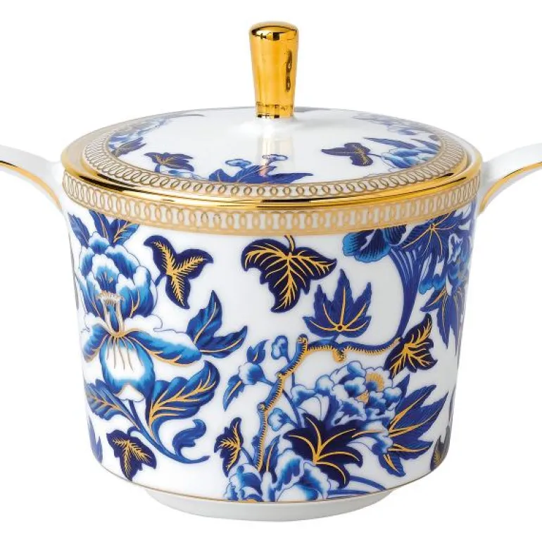 Hibiscus Cov Sugar 0.2L Iconic. Inspirert av et Wedgwood-arkivmønster som dateres tilbake til rundt 1810, er Hibiscus en sofistikert kolleksjon med tidløse, klassiske elementer og rikt utsmykket med gull. Dette stilige mønsteret har et slående design av orientalske blå nyanser og overdådige botaniske detaljer, og med 22 karat gull påført for hånd for en elegant og overdådig finish. Perfekt til formelle middager, men kan også bruke som et stilfult alternativ til hverdags. Er flott i kombinasjon med hvitt.