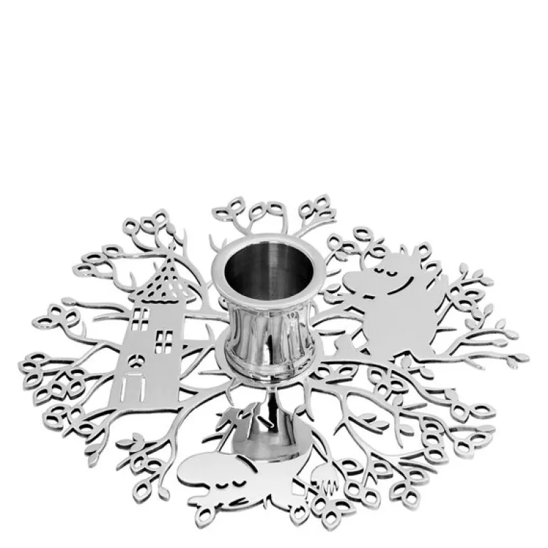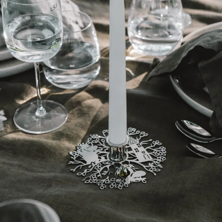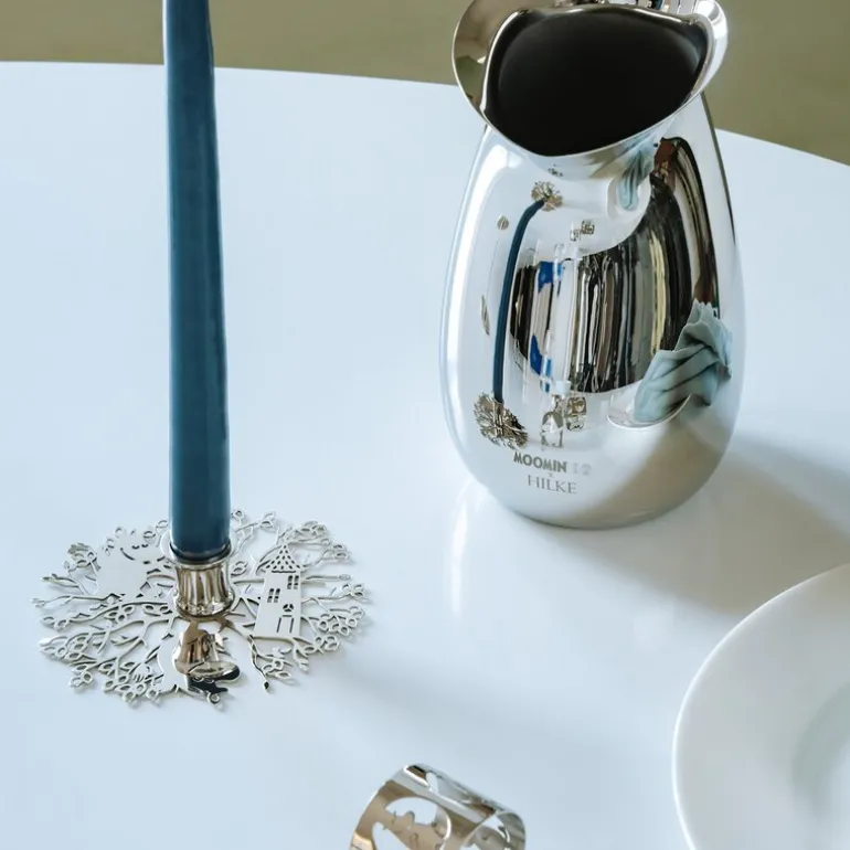 Opplev det eksklusive samarbeidet mellom Hilke Collection og Moomin med Hilke x Mummi No.1 lysestake 13,2×3,3 cm nikkelbelagt messing. En lysestake inspirert av den første Moomin-boken, ‘Småtrollene og den store oversvømmelsen,’ der Moomin-karakterer gjemmer seg i tregrenene, skjermet for stormen, mens de venter på at hele familien skal samles i Mummihuset.