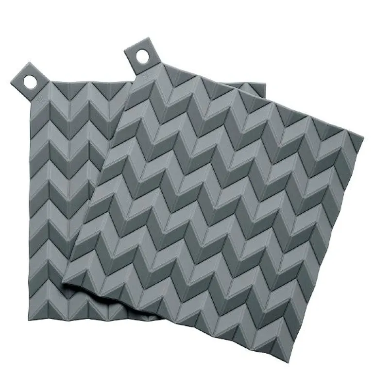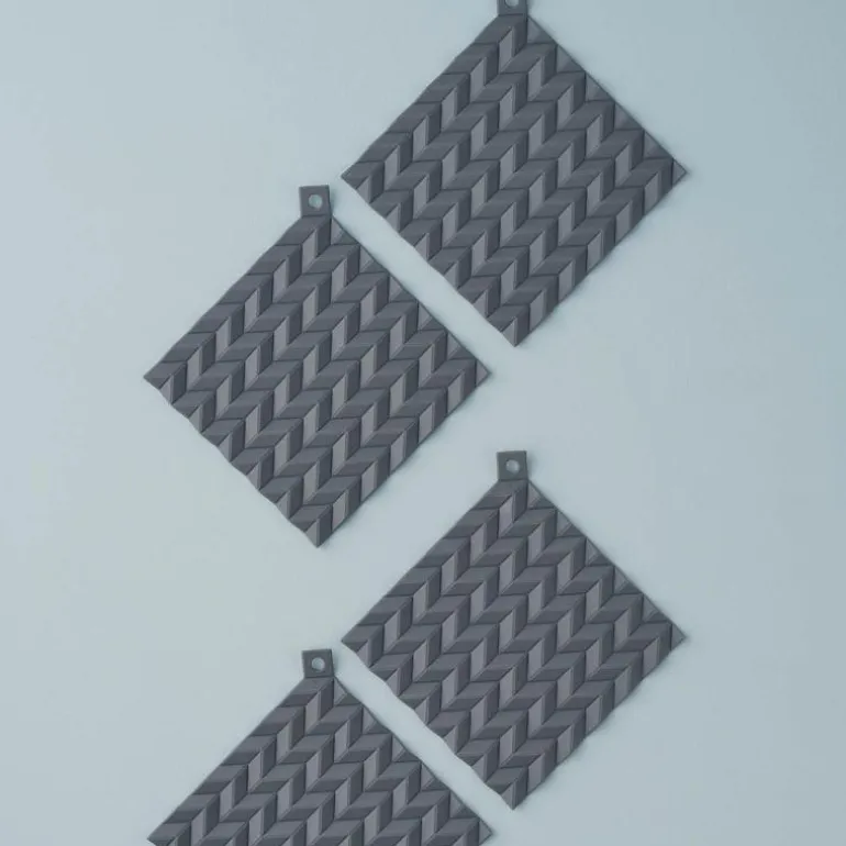 HOLD-ON er moderne grytekluter og bordskånere i ett. HOLD-ON grytekluter er laget av silikon som tåler opptil 230 graders varme. Unngå å brenne fingrene – gryteklutenes struktur sikrer et godt grep og er mer varmeisolerende enn de tradisjonelle gryteklutene i stoff. HOLD-ON kan også brukes som smarte bordskånere under varme retter. I tillegg er de lette å rengjøre: Gi dem en runde med oppvaskbørsten eller kjør dem i oppvaskmaskinen for et hygienisk resultat. Gryteklutene har hull for opphenging og selges i sett.