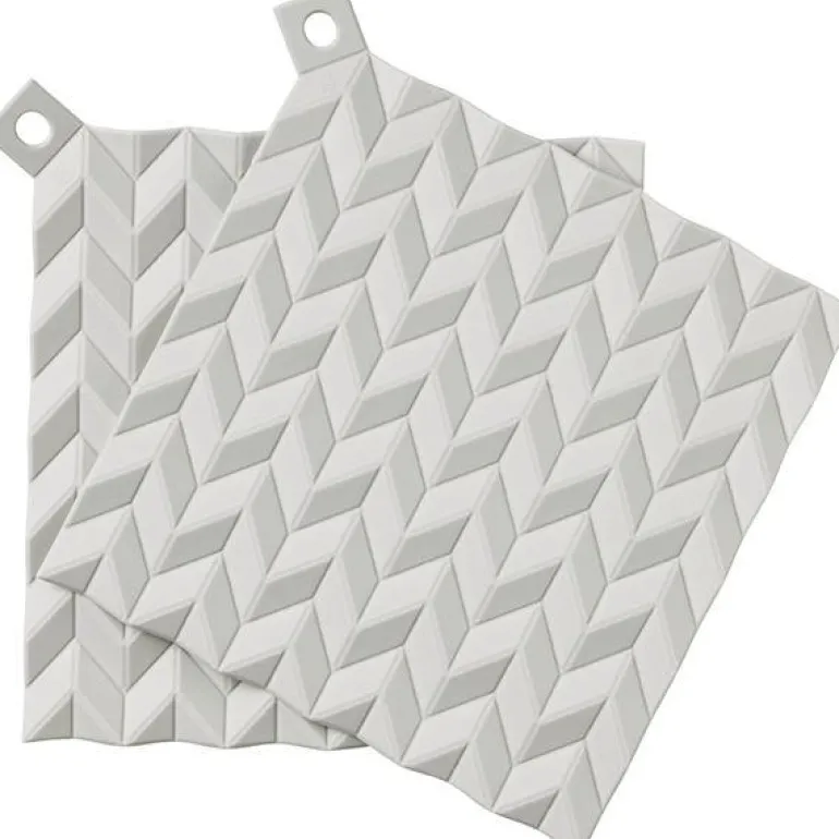 HOLD-ON er moderne grytekluter og bordskånere i ett. HOLD-ON grytekluter er laget av silikon som tåler opptil 230 graders varme. Unngå å brenne fingrene – gryteklutenes struktur sikrer et godt grep og er mer varmeisolerende enn de tradisjonelle gryteklutene i stoff. HOLD-ON kan også brukes som smarte bordskånere under varme retter. I tillegg er de lette å rengjøre: Gi dem en runde med oppvaskbørsten eller kjør dem i oppvaskmaskinen for et hygienisk resultat. Gryteklutene har hull for opphenging og selges i sett.