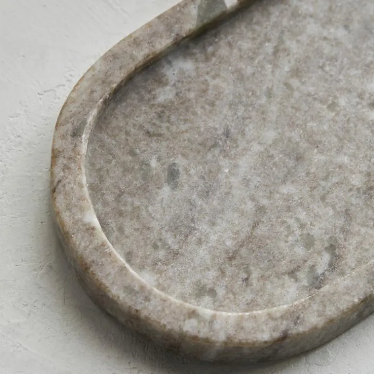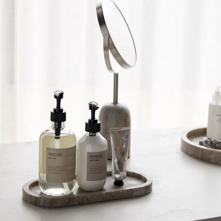 HOME brett 28 cm beige, fra Meraki. Sett dine såper, kremer og mer på dette tidløse og minimalistiske marmorbrettet fra Meraki. Et naturlig og allsidig materiale som gir en luksuriøs spa-stemning på badet ditt. Størrelsen passer perfekt til 3 Meraki-flasker, men er laget til akkurat det du vil oppbevare og fremheve. Fra toalettsaker til sminke og smykker. Inkorporer marmorlooken i hele hjemmet ditt og plasser et annet brett på soverommet eller kjøkkenet. En enkel design for det moderne hjemmet.