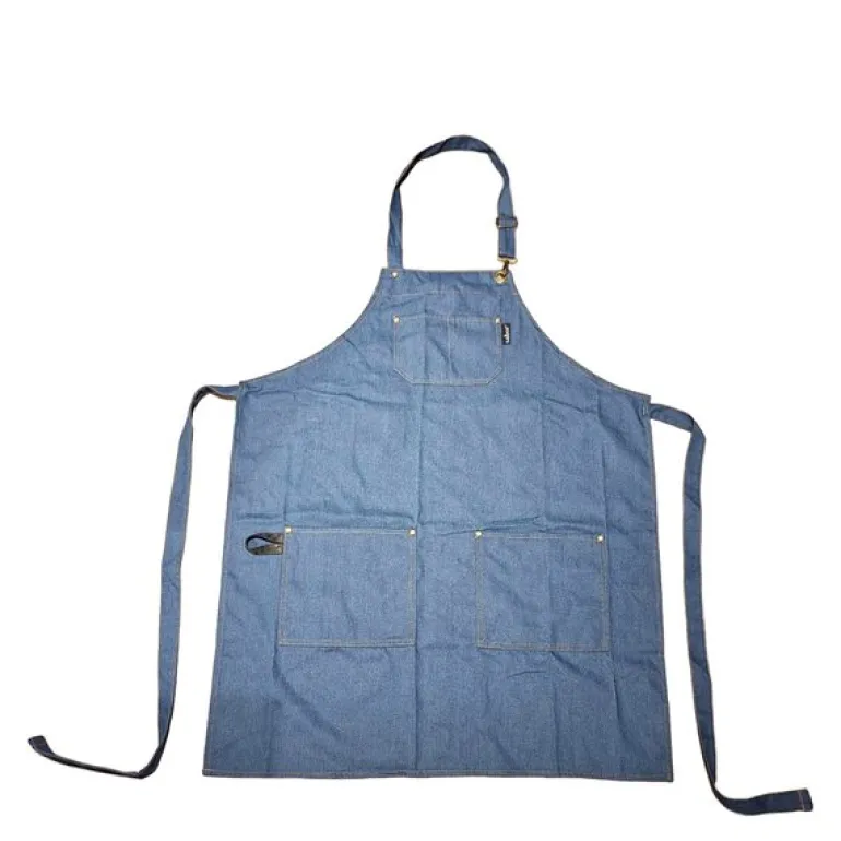 Dette blå forkleet fra Sabor kombinerer trendy design med praktisk funksjon. Det måler 85×70 cm og har en moderne jeans-look, med detaljer som messingknapper og justerbar nakkestropp for optimal komfort. Stroppen kan løsnes på én side for enkel håndtering.