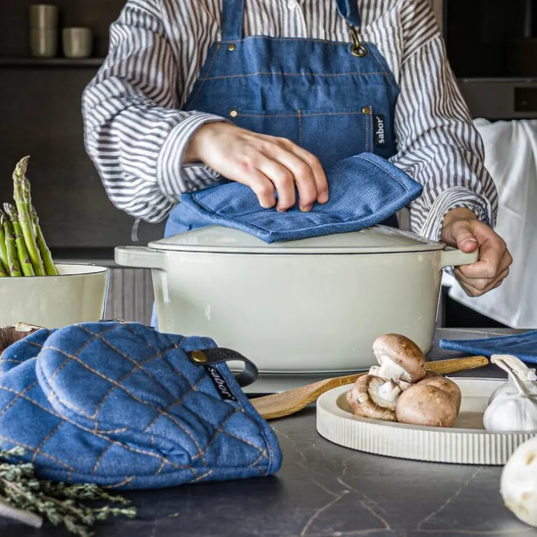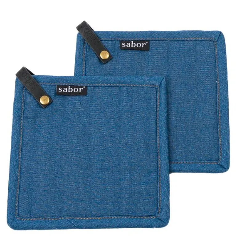 Home gryteklut 20×20 cm fra Sabor er en del av et sett med to moderne grytekluter i slitesterk kvalitet. De har en trendy jeans-look og er utstyrt med svarte skinnløkker som gir et dekorativt element og gjør dem enkle å henge opp. Klutene er ideelle for daglig bruk og tåler varme godt.