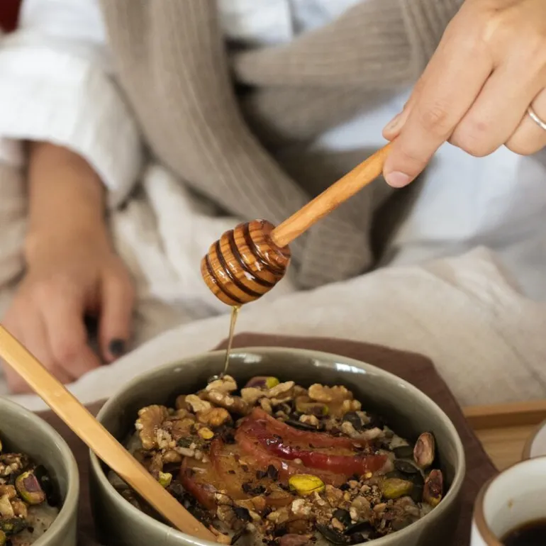 Honningskjeen i oliventre fra Heirol er 16 cm lang og formet for å gjøre servering av honning praktisk og presis. De dype rillene holder godt på honningen og lar deg dryppe akkurat passe mengde på maten.