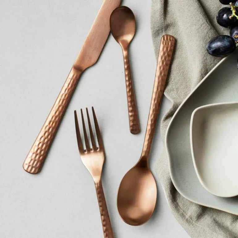 Bestikksett, Hune 16 deler hamret kobber, fra Broste Copenhagen. Bestikksettet er utført i kobberfarget rustfritt stål, og gir et stilig utseende til spisebordet. Settet kommer i en lekker gaveeske, og består av 4 kniver, 4 gafler, 4 skjeer og 4 teskjeer. Tåler oppvaskmaskin opp til 65 grader.
