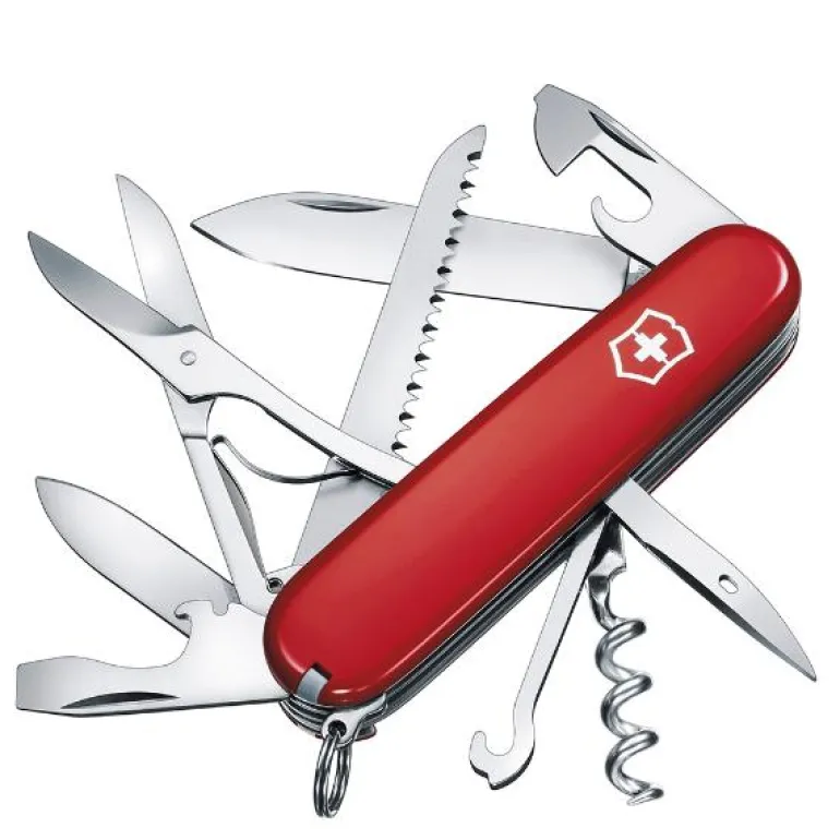 Victorinox lommekniv Huntsman rød 91mm i blisterpakning med 15 funksjoner inkludert stort og lite knivblad, saks, flaskeåpnere, vinopptrekker, syl og krok med flere bruksområder samt liten sag. Kniven er perfekt til å sage over grener og kutte tauverk ved klatring, hiking og camping. Kniven er i rustfritt stål med deksler i plast. Victorinox er et gammelt kvalitetsmerke på kniver fra Sveits.Det begynte med de verdensberømte Swiss Army Knives og produserte etterhvert kniver både til profesjonellt bruk og til hobby kokker.Victorinox har fokus på kvalitet, innovasjon og tradisjon.I de senere år også produserer de i tillegg andre produkter som klokker, reiseartikler og dufter.