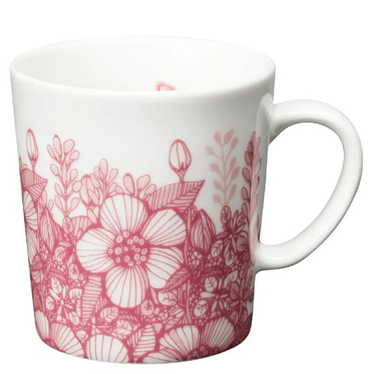 Huvila mug 0,3L. Designer Heini Riitahuhta ble inspirert av den varme følelsen i bestemorens hjem og den gode stemningen. Mønsteret er basert på en villrose med et snev av det gamle Finland og velkjente Arabia. De moderne formene sammen med et delikat mønster gjør at serviset skiller seg ut i borddekkingen. Designer Heini Riitahuhta. Kan vaskes i oppvaskmaskin.