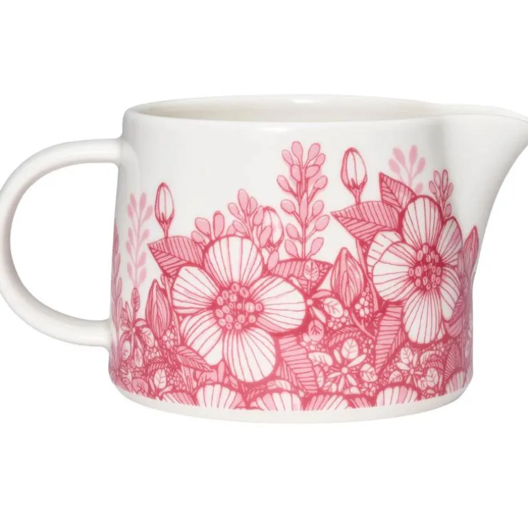 Den lave Huvila-muggen 0,35L er et vakkert supplement til kaffeserveringen. Den egner seg perfekt som melkemugge eller til servering av ulike sauser til middag eller dessert. Det rosa rosemønsteret tegnet for hånd av Heini Riitahuhta passer naturlig sammen med hvite serviser og blir midtpunktet i borddekkingen.
