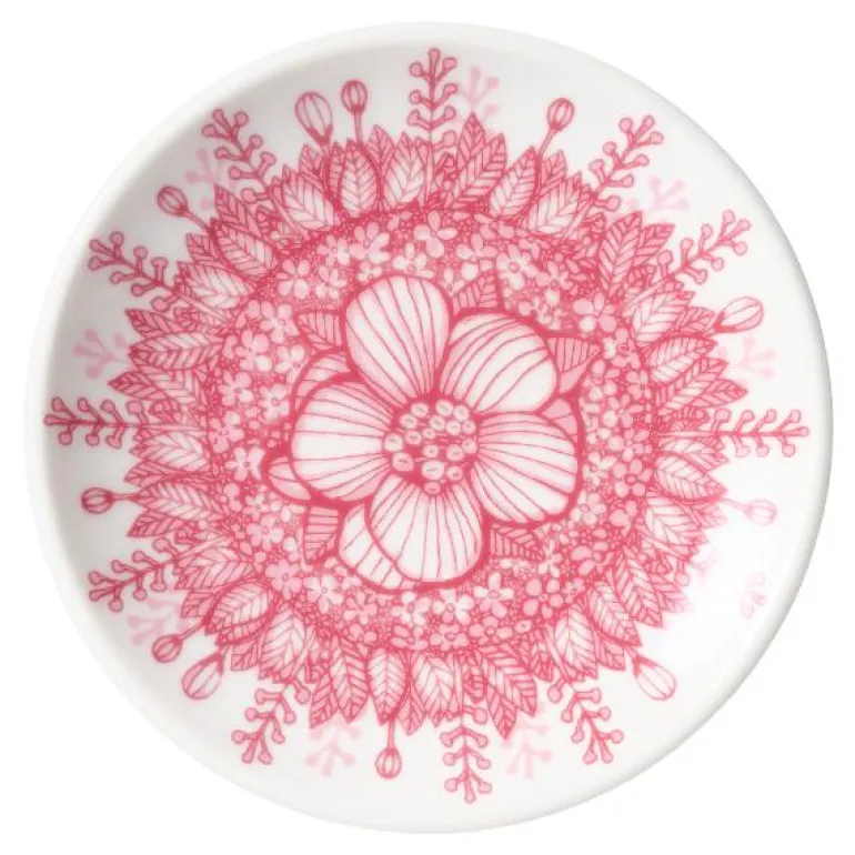 På Huvila-tallerkenen blomstrer delikate rosafargede villroser som er tegnet på frihånd. Huvila, designet av Heini Riitahuhta, minner om bestemors rosebusker. Den lille tallerkenstørrelsen er flott til servering av snacks eller som asjett til krus. Kombiner med andre deler fra Huvila-serien eller som et midtpunkt i en borddekking med hvite serviser