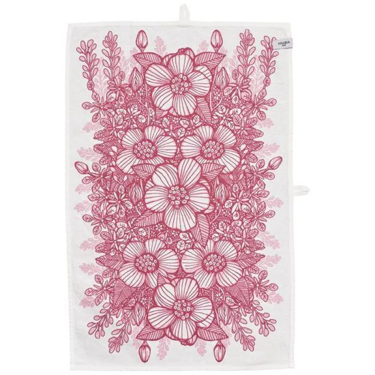 Huvila tea towel 43x67cm. Designer Heini Riitahuhta ble inspirert av den varme følelsen i bestemorens hjem og den gode stemningen. Mønsteret er basert på en villrose med et snev av det gamle Finland og velkjente Arabia. De moderne formene sammen med et delikat mønster gjør at serviset skiller seg ut i borddekkingen. Designer Heini Riitahuhta. Kan vaskes i oppvaskmaskin.