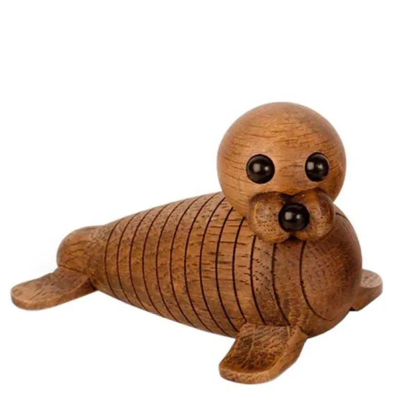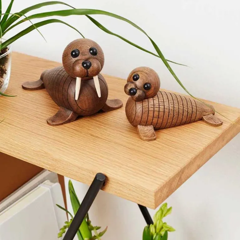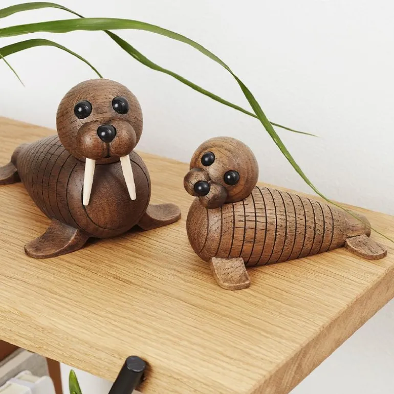 Trefigur hvalross, Ross, liten fra Spring Copenhagen.Hvalrossen Ross er en kjær liten følgesvenn til sin far Wally, og passer vakkert inn i den arktiske familien. Ross er laget i mørkbeiset eik, og det litte hodet kan dreies slit at det søte ansiktet kommer til syne. Ross er litt klossete, men han ser godt etter hvordan faren Wally svømmer og fanger blåskjell på havbunnen. En vakker dag vil han sikkert lære det også. Av og til kan han bli overveldet av alle de nye inntrykkene. Da er det fint å svømme inn til land og ta seg en velfortjent lur i solen.Hvalrossen Ross I likhet med den store varianten, Wally, er Ross designet av Chresten Sommer. Trefiguren er laget i FSC-merket eik.Mål:Lengde: 12 cmBredde: 7 cmHøyde: 7 cm