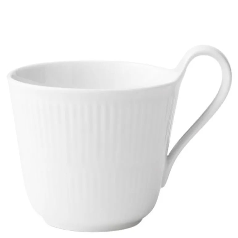 Hvit Riflet forteller historien om kongelig porselen og håndverk i en minimalistisk og moderne stil. Resultatet? En moderne klassiker. Dens rene hvithet og enkle design gjør den ideell å kombinere med andre riflede design. For de som liker å nyte livet uten at det går på bekostning av kvalitet, er Hvit Riflet et ideelt hverdagsservise for det moderne hjem. Elegant og enkelt. Grunndesignet er identisk med servisene Musselmalt Riflet, Blå Mega Riflet og Hvit Signatur. Det passer godt sammen med disse – men er også moderne og elegant på egen hånd! Hvit riflet kopp med hank 33 cl. Tåler oppvaskmaskin og mikrobølgeovn.