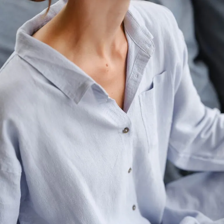 Hydra skjorte L lys blå fra Høie. Hydra nattskjorte i lin og bomull er som en drøm å ha på. Den passer like bra til en god natts søvn som til en avslappet morgenkaffe. Skjorten er den perfekte kombinasjonen av komfort og stil, slik at du slipper å måtte velge. Skjorten har en løs og ledig modell, med knapper hele veien og skjulte lommer i siden.