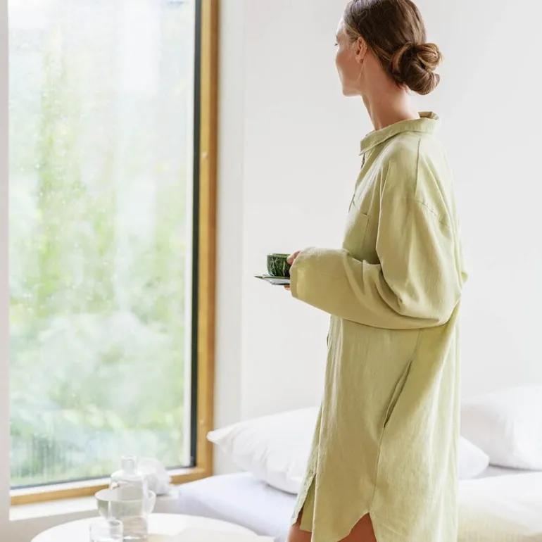 Hydra skjorte S dempet lime fra Høie. Hydra nattskjorte i lin og bomull er som en drøm å ha på. Den passer like bra til en god natts søvn som til en avslappet morgenkaffe. Skjorten er den perfekte kombinasjonen av komfort og stil, slik at du slipper å måtte velge. Skjorten har en løs og ledig modell, med knapper hele veien og skjulte lommer i siden.