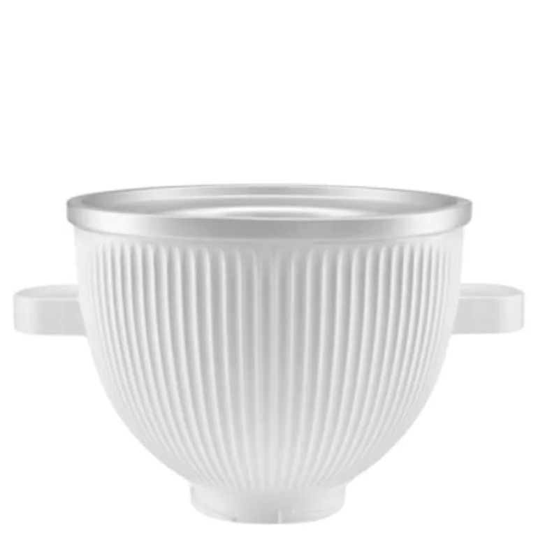 Med iskremmaskinen kan du på mindre enn 30 minutter lage fantastisk jevn og glatt is eller sorbet som vil imponere middagsgjestene dine. 5KSMICM har både blandeverktøy og glassbolle i et nytt, forbedret design. Skålenheten og de doble håndtakene gjør det enklere å håndtere og koble til KitchenAid kjøkkenmaskinen din. Iskremskålen har en kapasitet på 1,9 liter, og blandeverktøyet roterer i bollen langs sidene, noe som resulterer i jevn frysing og grundig blanding av ingrediensene. For å oppnå det beste resultatet bør den forhåndsfryste glassbollen fryses i 16 timer før bruk.