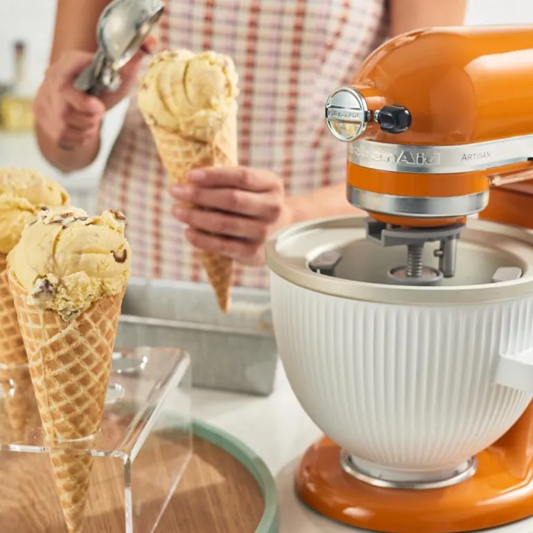 I nesten et århundre har KitchenAid vært dedikert til å ta mat på alvor, og deres produkter representerer en perfekt blanding av profesjonell ytelse, håndverkskvalitet og ikonisk design. Med Ice Cream Maker tilbehøret kan du løfte dine dessertopplevelser til et nytt nivå og nyte hjemmelaget is med perfekt konsistens og smak, laget på den enkleste måten.