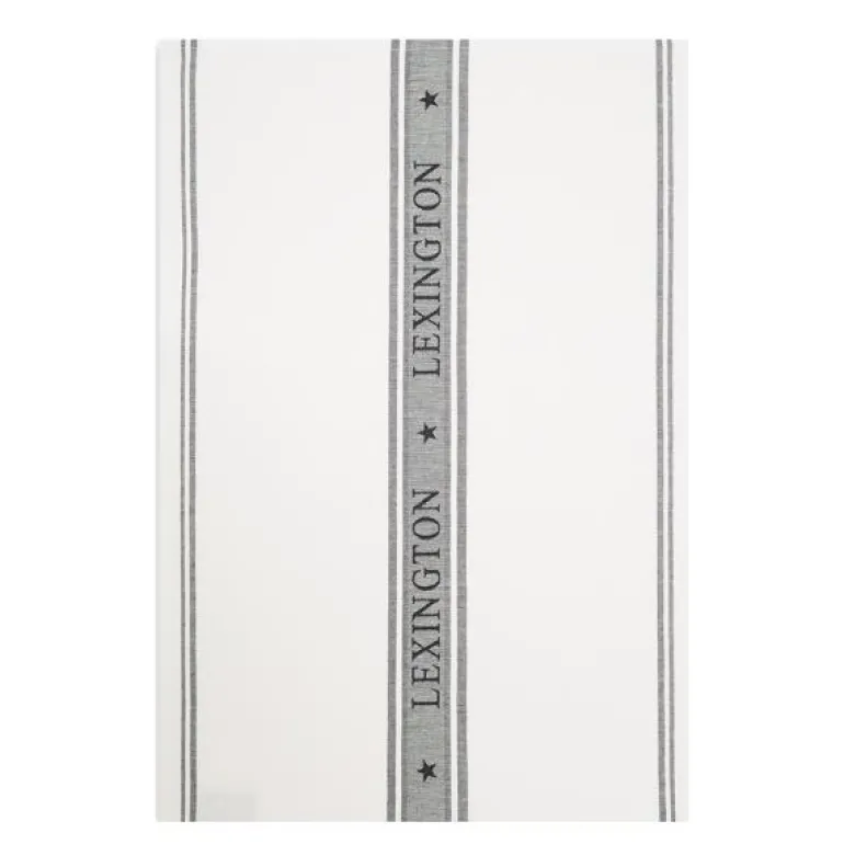Icons star kjøkkenhåndkle hvit/svart fra Lexington. Dette OEKO-TEX®-sertifiserte kjøkkenhåndkleet er i ren bomull og har et stilrent design med jacquardstriper. Det absorberende kjøkkenhåndkleet har merkenavnet på midten, brettet fald og hempe med logo.