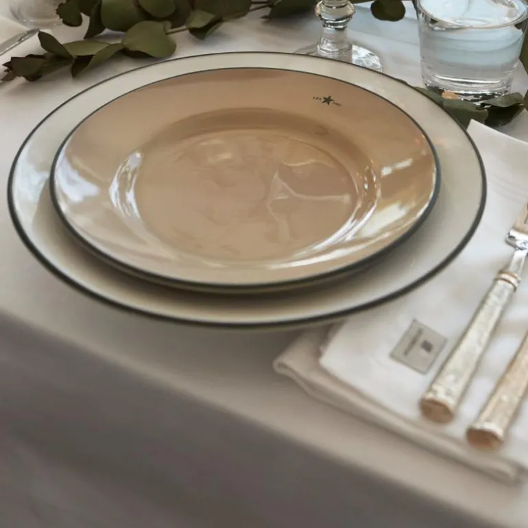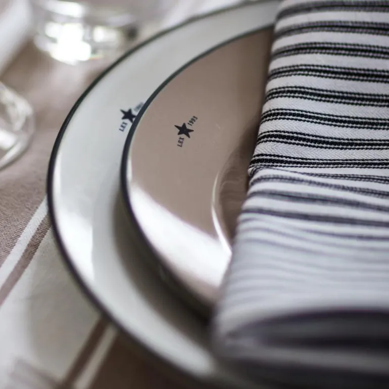 Icons tallerken 22,5 cm beige/blå fra Lexington. En fin glans kombinert med en organisk fargenyanse gir denne asjetten et moderne uttrykk. Den er produsert i Portugal av finkornet leire som er brent ved høy temperatur for å gi den fine glansen. Merkenavnet og etableringsåret står øverst, mens en håndmalt kant følger ytterkanten av denne asjetten.