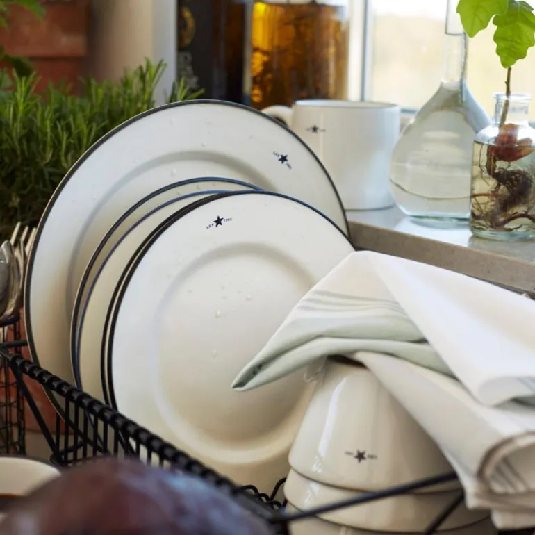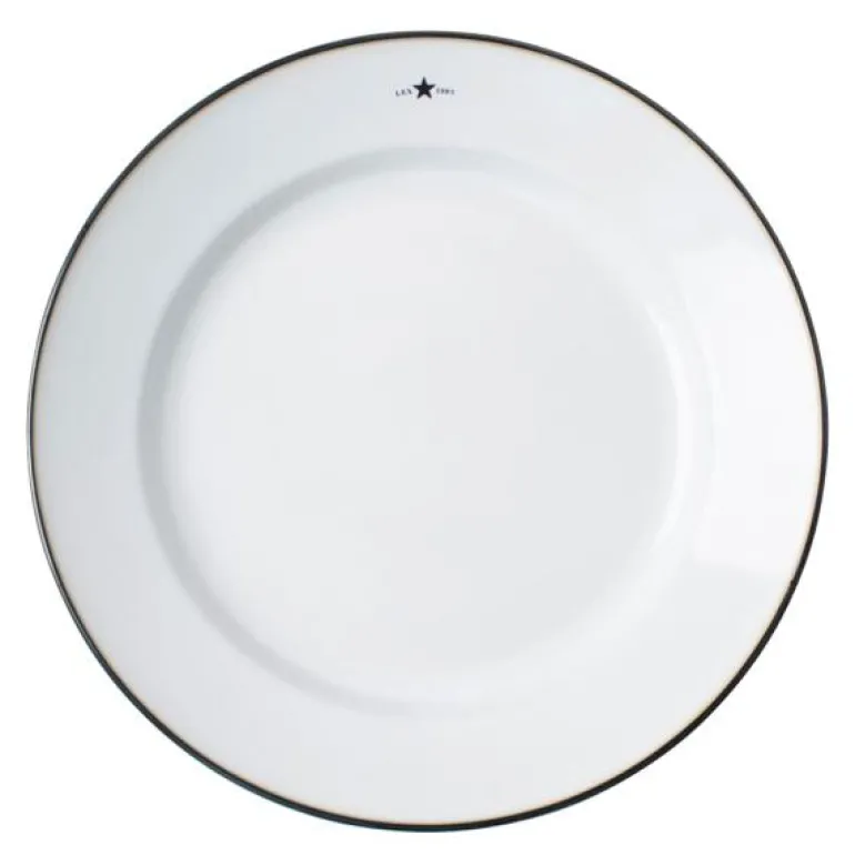 Icons tallerken 28 cm hvit/blå fra Lexington. Denne middagstallerkenen er laget i Portugal av noen av landets fremste håndverkere. De har brukt finkornet leire, og tallerkenen er brent ved ekstremt høy temperatur, noe som gir den en jevn, glasert overflate og gjør den mer motstandsdyktig mot riper og hakk. En håndmalt ring følger kanten av tallerkenen og viser merkenavnet og etableringsåret øverst.