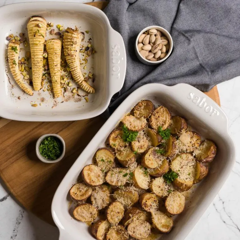 Den ildfaste formen fra Sabor, måler 42×26 cm og har en kapasitet på 3,5 liter. Produsert i steintøy med en vakker hvit glasur, er formen både funksjonell og estetisk. Håndtakene gir godt grep og har en subtil Sabor-logo som gir et ekstra designelement.