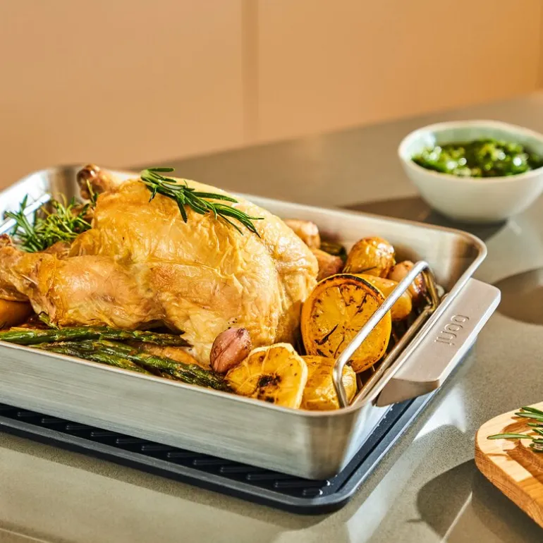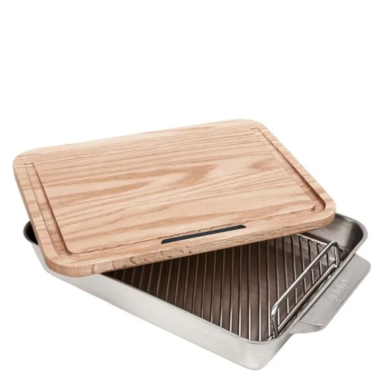 Med på kjøpet får du et grillstativ og en skjærefjøl i hvit eik, utformet med skrå design og riller for oppsamling av stekesjy – ideelt til sauser og sausbaser. Ergonomiske DuraGrab™-håndtak gir sikker og enkel håndtering, og silikonpluggen gjør rengjøringen enklere.