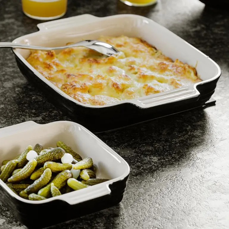 Sett med to av Le Creusets kvadratiske ildfaste former på 13 og 23 cm. Ovnsformene er den del av Classics serien, og er i fargen svart. Formene er ideelle til hverdagsbruk.