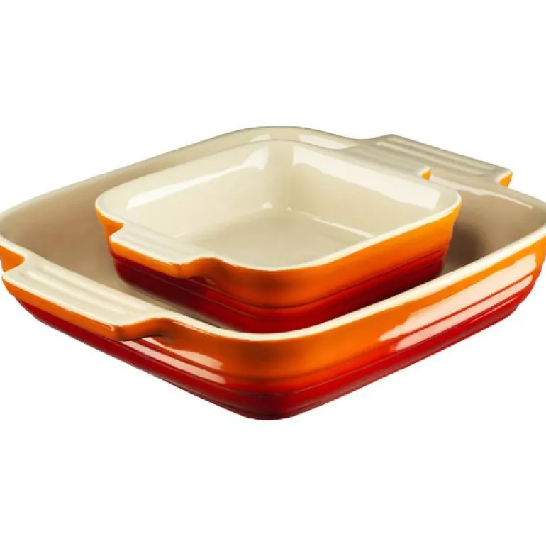 Sett med to av Le Creusets kvadratiske ildfaste former på 13 og 23 cm. Ovnsformene er den del av Classics serien, og er i fargen Volcanic. Formene er ideelle til hverdagsbruk.