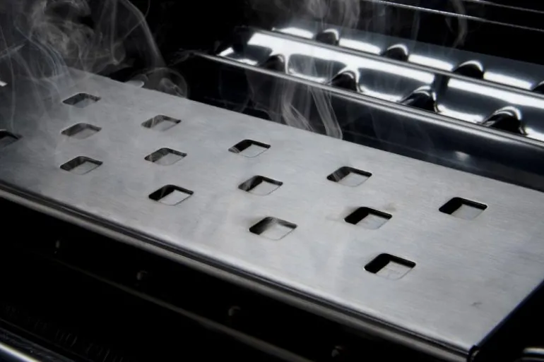 Broil King®-røykboks Imperial i rustfritt stål er utformet for å legges på stålbølgene Flav-R-Wave™. Med to kamre for dobbelt så kraftig røyking og integrert luftspjeld i det hengslede lokket er denne profesjonelle røykboksen noe utover det vanlige. Den kan også brukes med væsker for ekstra fuktighet og smak, eller med kombinasjoner av spon og væsker som gir uendelige smakskombinasjoner. 35x11x4 cm.
