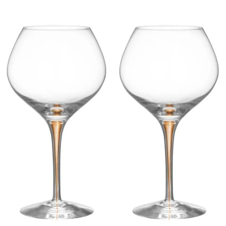 2stk. Intermezzo Bouquet vinglass 70cl i fargen gull fra Orrefors. Våre håntverkere og Erika Lagerbielke har lenge forsøkt å fylle Intermezzos karakteristiske boble med gull pgment. Endelig finnes den her, innbakt i det kystallklare glasset – en matt gull skimrende dråpe. Bouguet glasset som rommer 70 cl er et glass som passer utmerket til alle røde viner med frisk og fruktig karakter, uansett drue. Den store klokken lar vinet utvikles. Glasset er munnblåst i Sverige av våre dyktige glassblåsere. Design av Erika Lagerbielke.