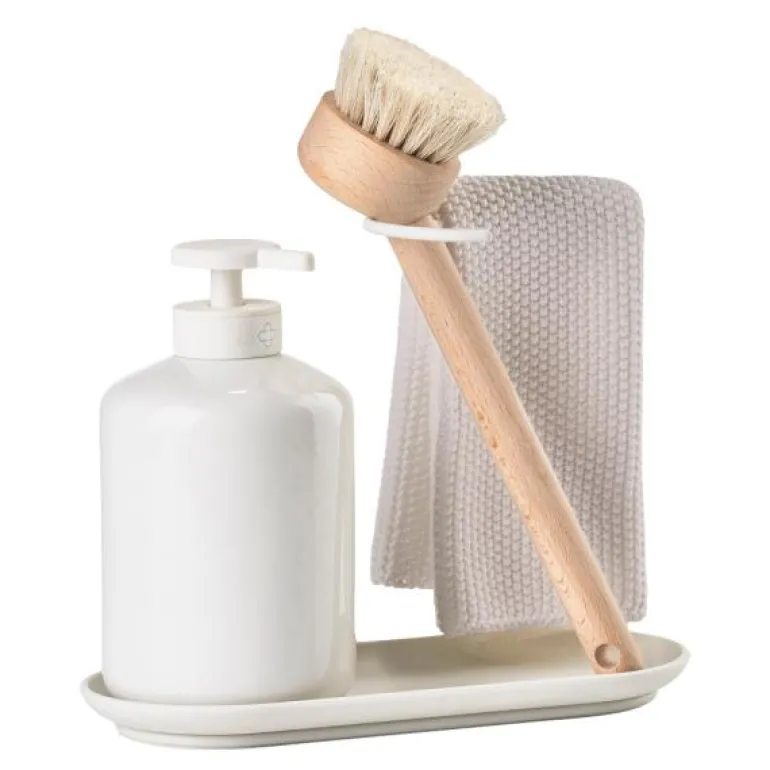 Inu oppvasksett 20 cm offwhite, fra Zone. Her er alt du trenger til den daglige oppvasken, verken mer eller mindre. En god, komfortabel børste, en romslig såpedispenser, en matchende oppvaskklut og et silikonbrett som skaper en flott ramme rundt oppvasken. Stålrammen som holder settet sammen, er avrundet på toppen slik at den danner en fin halvsirkel sett ovenfra. Den er lett å gripe tak i, slik at du kan flytte settet når du for eksempel skal gjøre rent. Samtidig gir rammen børsten et sted å hvile og kluten et sted å tørke. Gjennomtenkt, delikat og feminin design fra NEU Studio.
