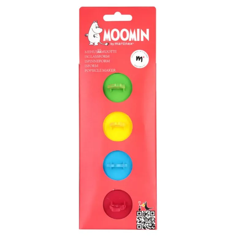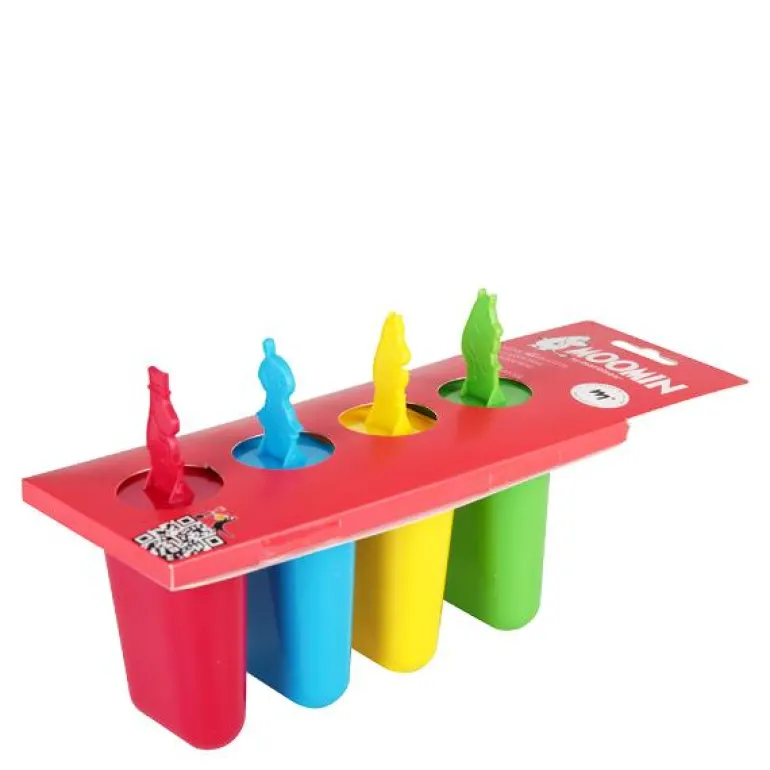 Nå kan du lage din egen Mummi is. 4 stk Ispinneformer i 4 fager med hver sin Mummifigur. Formene har et enkel design som gjør de lette å rengjøre. Kan fryses ned til minus 18 grader og er godkjent for bruk i oppvaskmaskin. Laget av PP-plast.