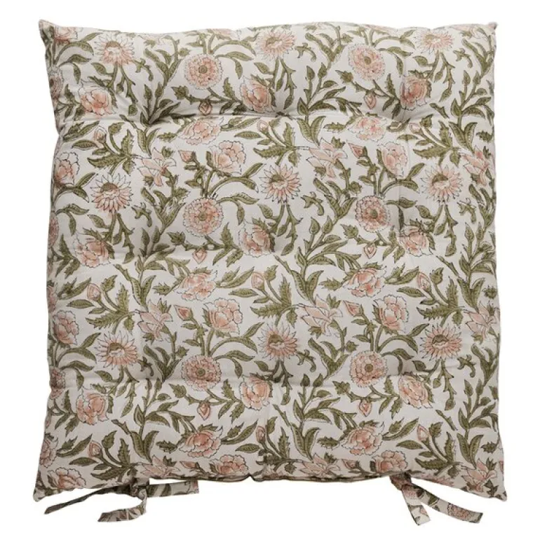 Den dekorative siden er blokktrykt og gir et håndverksinspirert preg, mens baksiden har en rolig, ensfarget tone som gjør stylingen enkel. Passer perfekt i Norah-stolene – eller som et sjarmerende innslag i stuen, på kjøkkenet eller uteplassen.