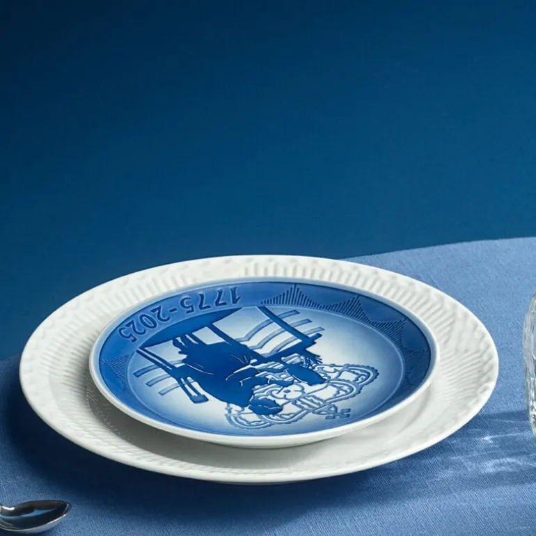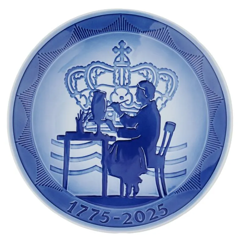 Jubileumstallerken 1775-2025 fra Royal Copenhagen er en del av feiringen av fabrikkens 250-årsjubileum. Designet er inspirert av minneplatten fra 1975 og viser en elegant silhuett av en porselensmaler, basert på Else Hasselriis’ papirklipp fra 1927.
