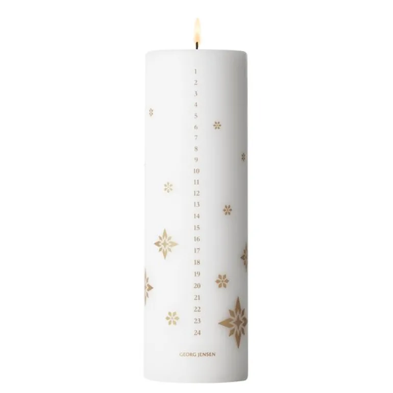 Jul 2024 kalenderlys 6×25 cm fra Georg Jensen i hvit/gull er en del av den vakre juleserien designet av Sanne Lund Traberg, en langvarig samarbeidspartner med Georg Jensen.