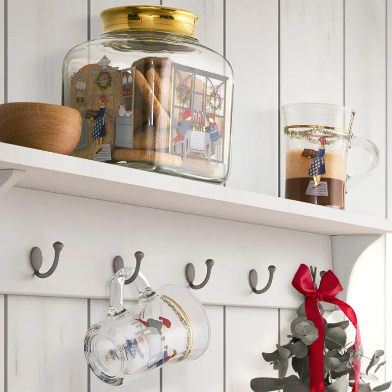 Jette Frölichs motiv for 2024 på jule-hotdrinkglassene tar oss med inn i hjemmets hjerte: kjøkkenet. Det er her magien skjer i desember, med duften av julekaker og smaken av tradisjonell julemat som har vært etterlengtet helt siden forrige jul. Men kjøkkenet er mer enn bare et produksjonssted for julegodteri; det er også et sted for hygge og fellesskap. Det er her gavene pakkes inn, adventskransen tennes, og vi varmer oss med en deilig drikke mens frosten biter utenfor. Duften av ferskt bakverk fyller rommet, mel og sukker står klart til bruk, juleeplene pynter skålene, og stemningen er komplett med hyasinter i glass og julekranser i vinduene.