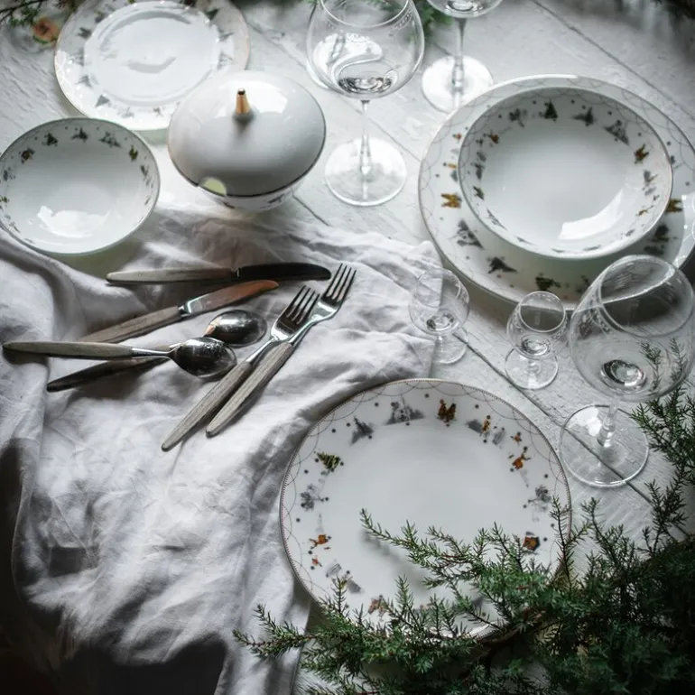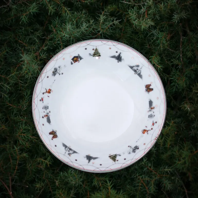 Tallerkenen er laget av edelt benporselen, kjent for sin varme, hvite farge og vakre gjennomskinnelighet, som fremhever de detaljerte illustrasjonene av dyr, hus og trær på en subtil måte. Selv om benporselenet har en sart og delikat utstråling, er det et svært slitesterkt materiale av høy kvalitet som tåler daglig bruk og rengjøring i oppvaskmaskin. Når du holder tallerkenen mot lyset, vil du kunne se den karakteristiske gjennomskinneligheten som kjennetegner ekte benporselen, og som gir serviset sitt eksklusive preg.