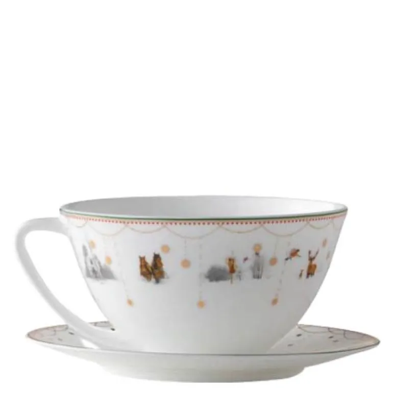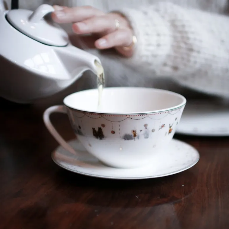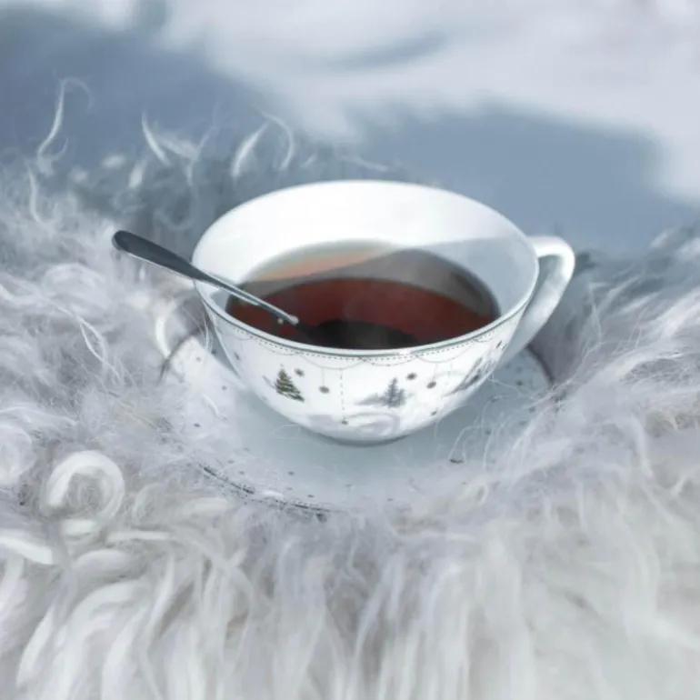 Julemorgen Story tekopp med skål på 40 cl fra Wik & Walsøe er et elegant servise laget i benporselen, perfekt til spesielle anledninger som julen. Benporselenets glansfulle og gjennomskinnelige utseende gir et sofistikert uttrykk som hever stemningen rundt bordet. Med en vakker, varm hvitfarge, utgjør dette serviset en nydelig bakgrunn for illustrasjonene som pryder koppene, med motiver av dyr, tradisjonsrike hus og trær, som fremkaller minner fra vinterlandskap og norske juletradisjoner.