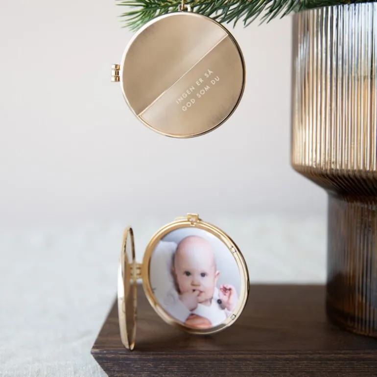 Årets julepynt 2024 fra Pictureit vakkert dekorert med teksten «INGEN ER SÅ GOD SOM DU». En elegant medaljong formet som en julekule med plass til et personlig bilde inni. Medaljongen er laget av solid metall og forgylt med 14 karat gull, med en fin børstet overflate som gir et sofistikert uttrykk.