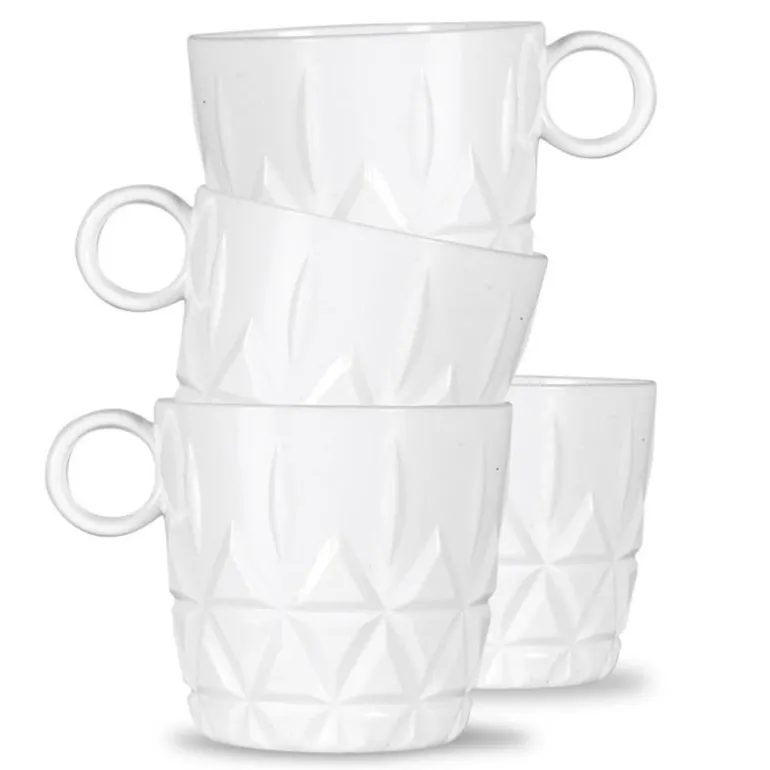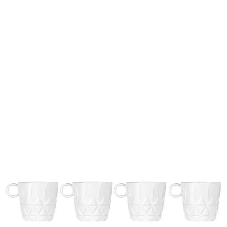 Fire piknik kaffekopper, Juni, fra Sagaform. Et godt kaffekrus gjør kaffen enda bedre – det vet vi allerede. Dette nydelige kaffekruset er laget av akrylplast i en luksuriøs og skarp eggeskallhvit farge med et vakkert krystallmønster. Et krus som lyser opp kaffetiden din og som varer lenge. Kaffekoppene rommer 20 cl.