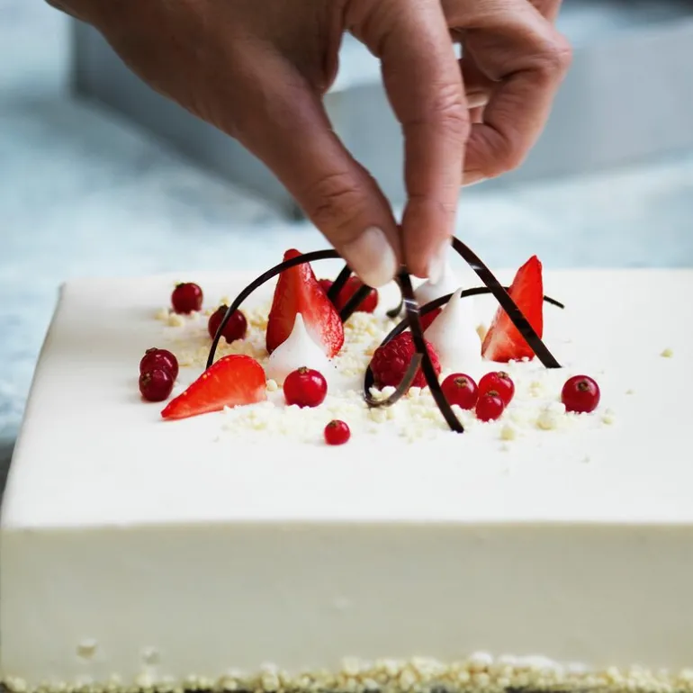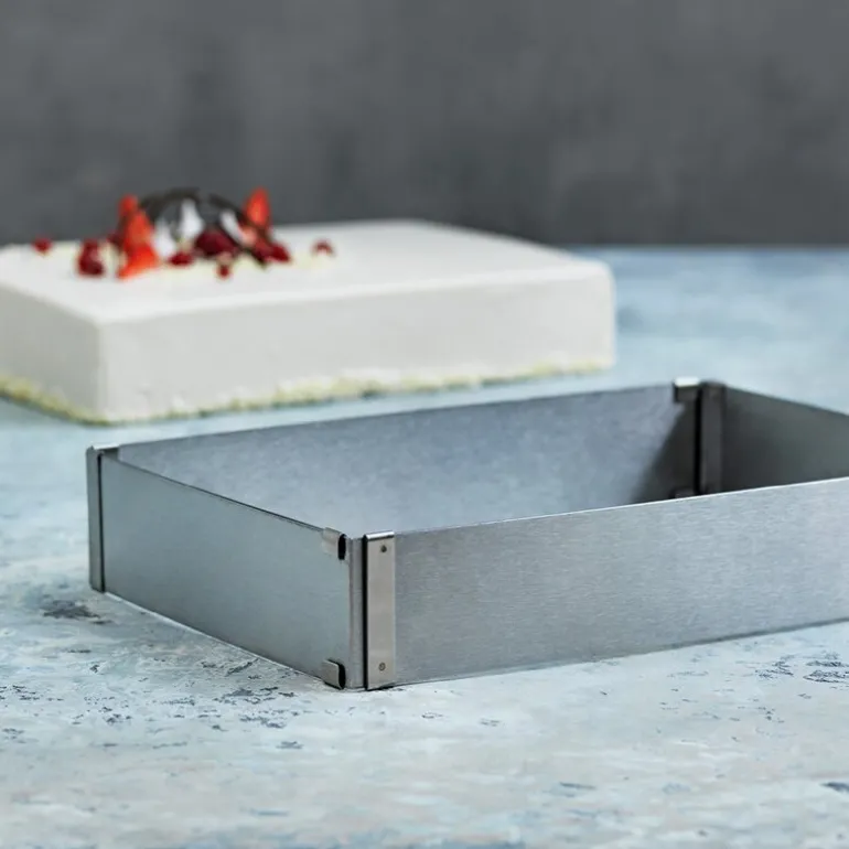Justerbar rektangulær kakeramme fra Blomsterbergs laget av rustfritt stål. Formen er 5 cm høy og kan enkelt justeres i størrelse fra 18 x 25 cm til 34 x 53 cm, slik at du får nøyaktig den størrelsen du trenger. Egner seg godt til både bakverk og støpte desserter.
