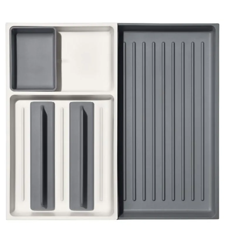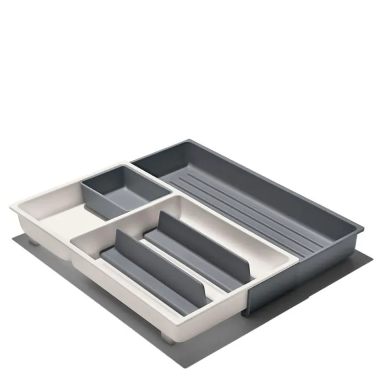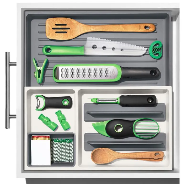 OXOs justerbare skuffeinnsats hjelper deg med å holde orden i kjøkkenskuffene uansett hvilken størrelse skuffene har. Skuffeinnsatsen kan tilpasses etter behov med flyttbare skillevegger. Det medfølger et avtagelig rom til småting, som det kan være vanskelig å holde styr på, f.eks. vinkorker, poselukkere og maiskolbeholdere. Sklisikre føtter holder skuffeinnsatsen på plass når skuffen åpnes og lukkes, og de firkantete hjørnene eliminerer mellomrommene, maksimerer utnyttelsen av plassen, og sørger for at du får et rent look i skuffene dine.