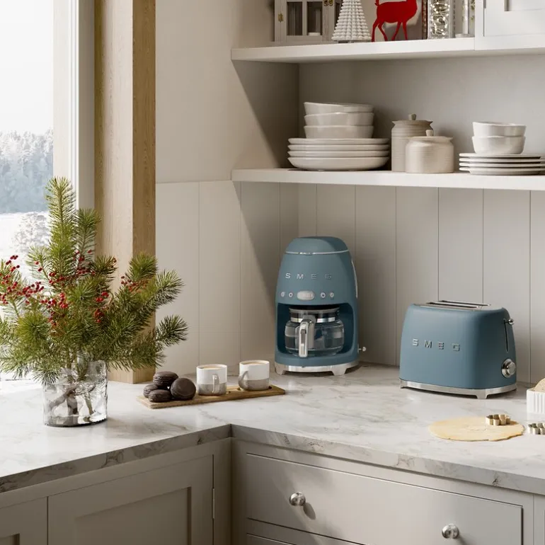 Kaffetrakter DCF02 i storm blue fra Smeg er en perfekt blanding av retrodesign og moderne funksjonalitet. Med sin elegante 50-tallsstil og kapasitet til å brygge opptil 10 kopper kaffe, er den ideell for både små og større husholdninger. Den pastellblå fargen gir et sofistikert preg, og det stilrene designet gjør kaffetrakteren til et blikkfang på kjøkkenbenken.